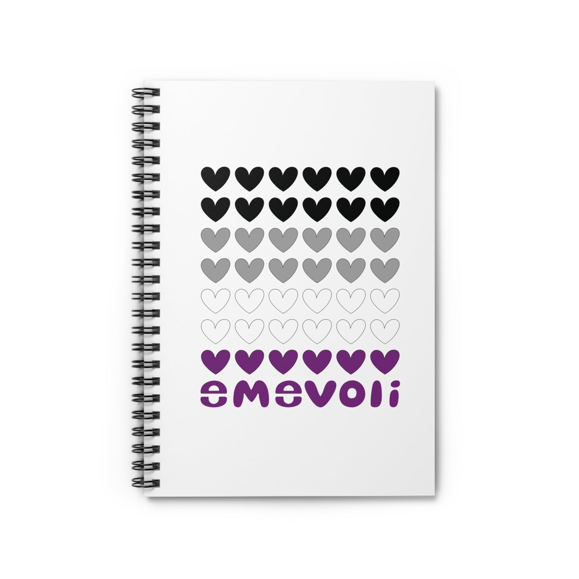 A ruled line notebook with a heart design featuring emevoli in Asexual Flag Colors. Perfect for writing notes, journaling, or sketching. This notebook adds a pop of color and positivity to your daily routine. Ideal for students, creatives, or anyone who loves stationery.