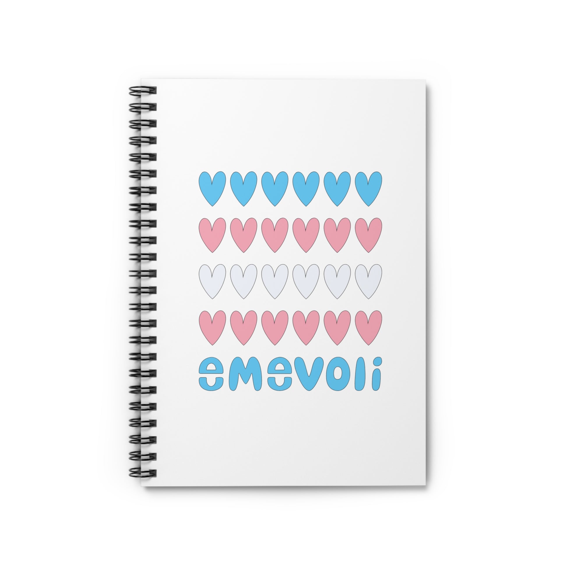A ruled line notebook with a heart design featuring emevoli in Trans Flag Colors. Perfect for writing notes, journaling, or sketching. This notebook adds a pop of color and positivity to your daily routine. Ideal for students, creatives, or anyone who loves stationery.