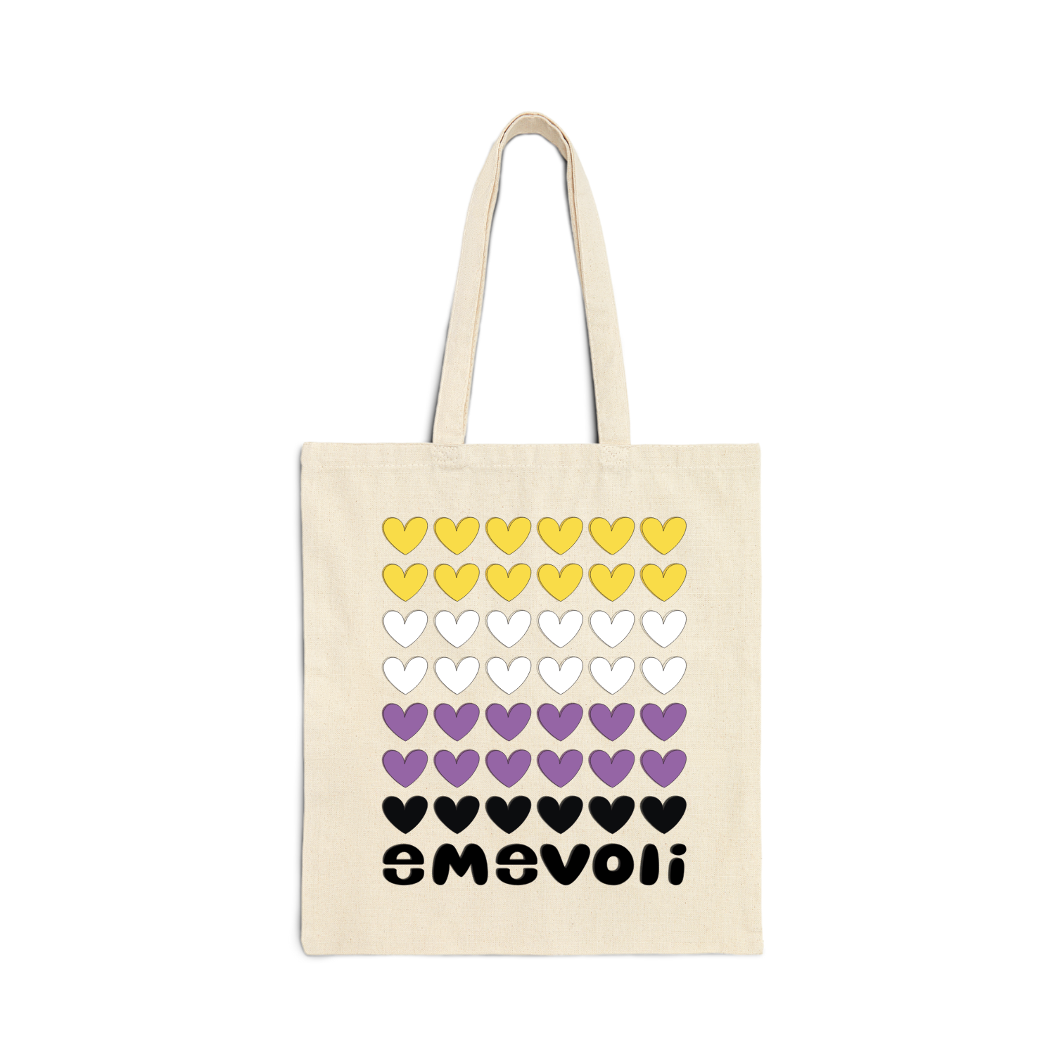 A sturdy and stylish tote bag designed with hearts and emevoli in the colors of the NonBinary Flag. Perfect for carrying groceries, books, or everyday essentials
