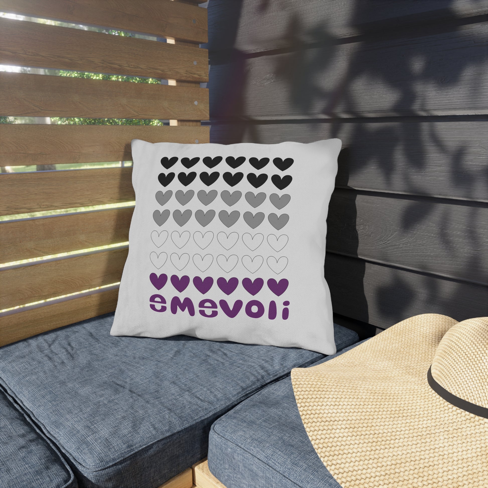 Add a touch of love and pride to your outdoor space with these vibrant Outdoor Pillows featuring hearts with emevoli in the colors of the Asexual Flag. Perfect for adding a pop of color and personality to your patio or garden, these pillows are water and UV resistant, making them ideal for outdoor use. The comfortable spun polyester material ensures they keep their shape and remain wrinkle-free, while the double-sided print adds versatility to your decor.