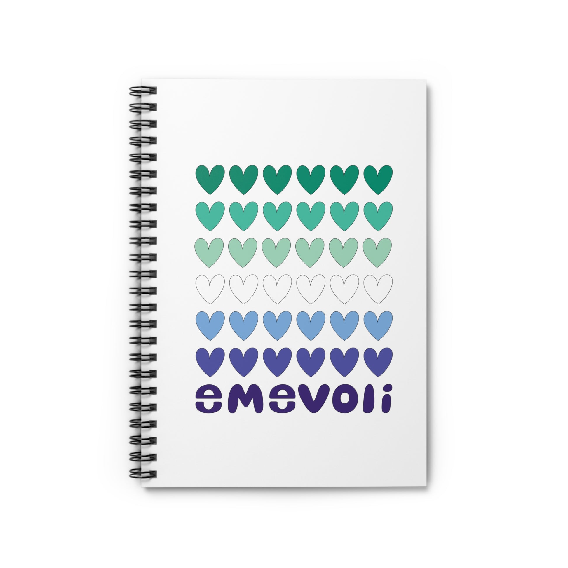 A ruled line notebook with a heart design featuring emevoli in Gay Men's Flag Colors. Perfect for writing notes, journaling, or sketching. This notebook adds a pop of color and positivity to your daily routine. Ideal for students, creatives, or anyone who loves stationery.